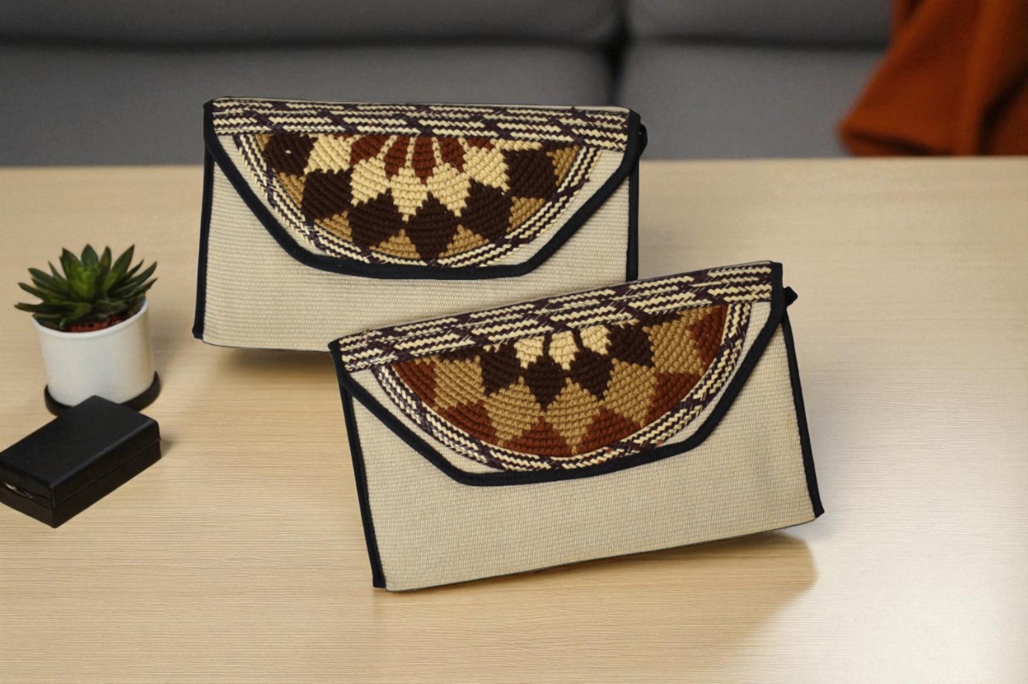 Descipcion: Hecho a mano con tejido en a crochet, caña flecha, en telar vertical, color tabaco, negro y café, envío incluido