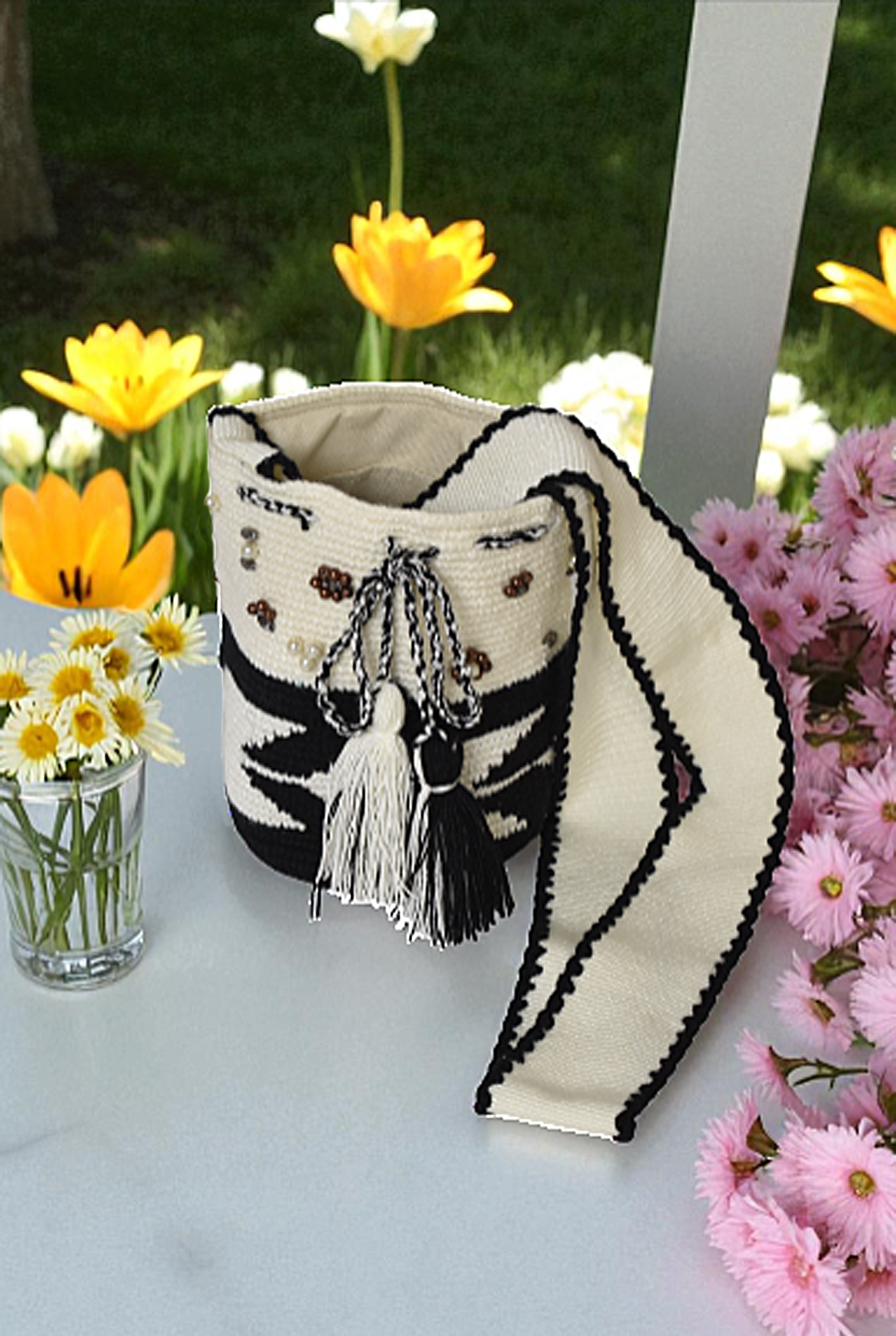 Descipcion: Hecho a mano en tejido a crochet, color beige, negro, decorada recamada con perla, envío incluido