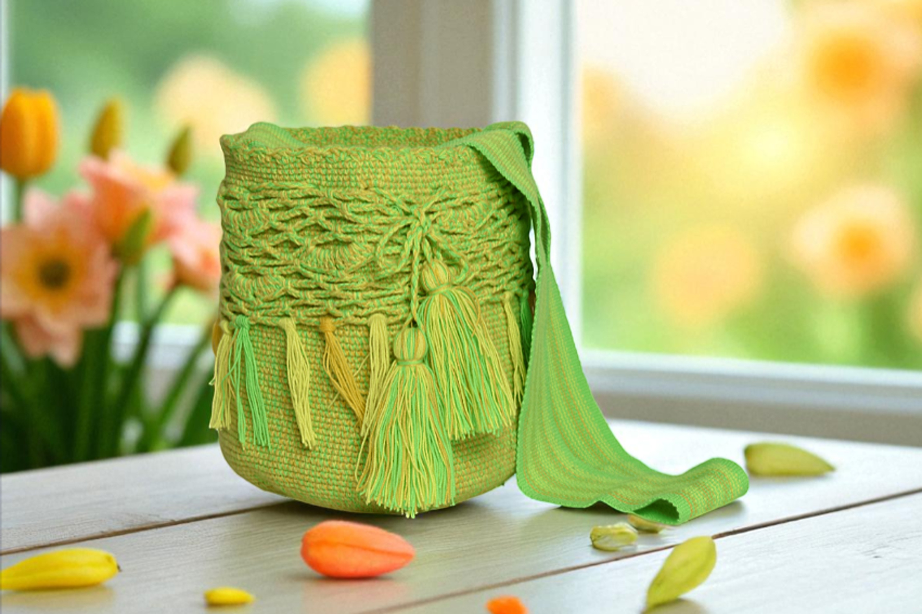 Descipcion: Hecho a mano a crochet, adornado con macramé, color matizado verde, amarillo, naranja, envío incluido.