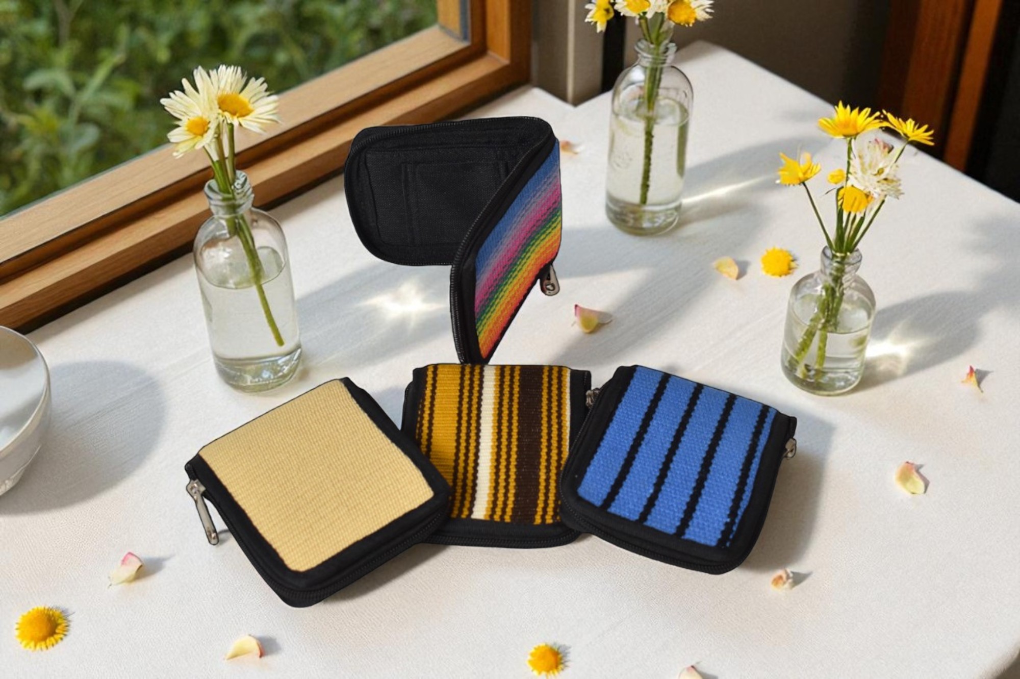 Descipcion: Hecho en telar vertical, en colores surtidos, con cierre en cremallera, producto trio, envío incluido