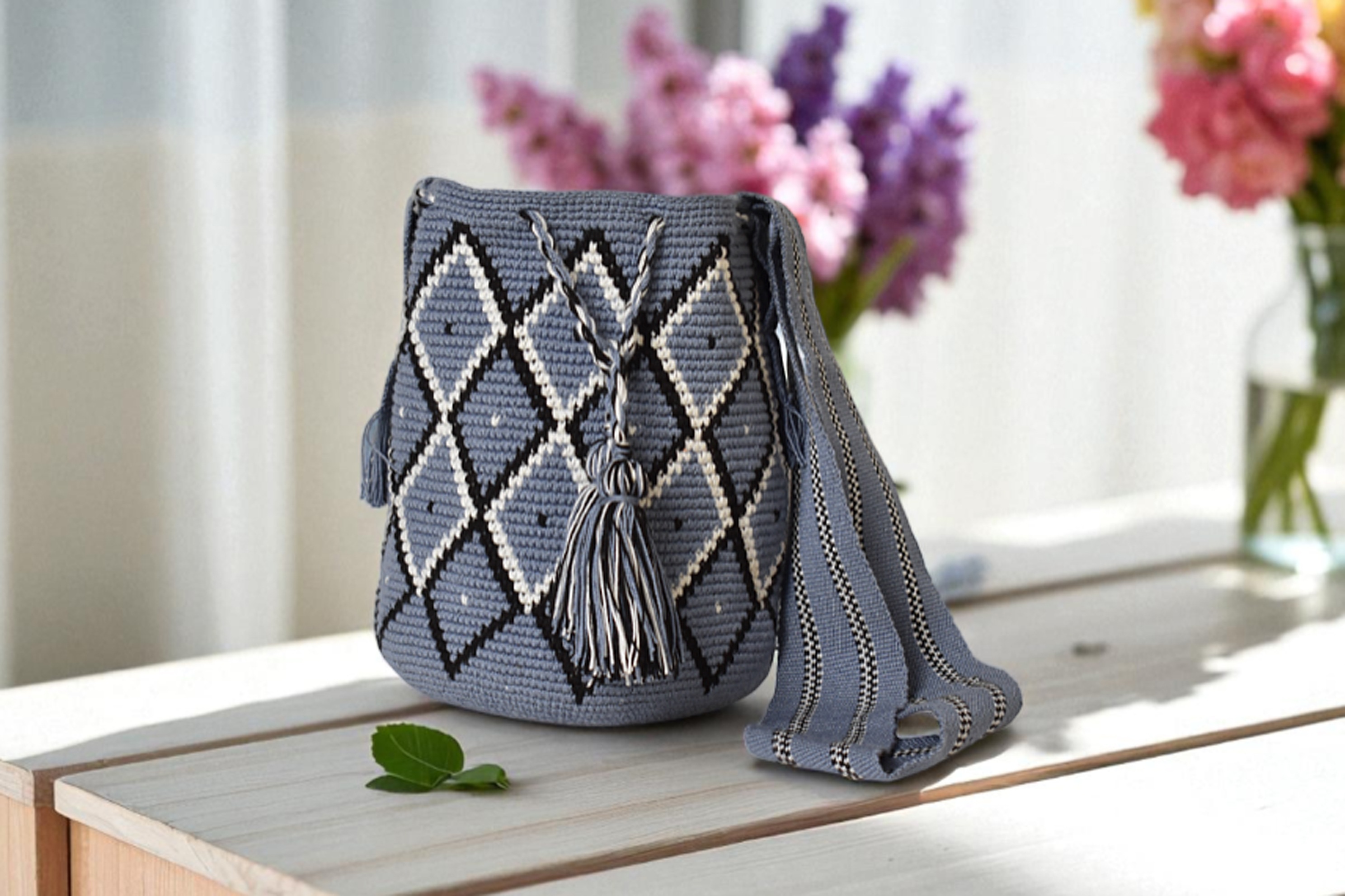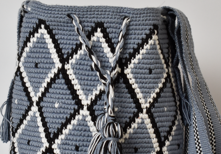 Descipcion: Mochila tejida en crochet con figuras en diamante con colgante es tejido fino