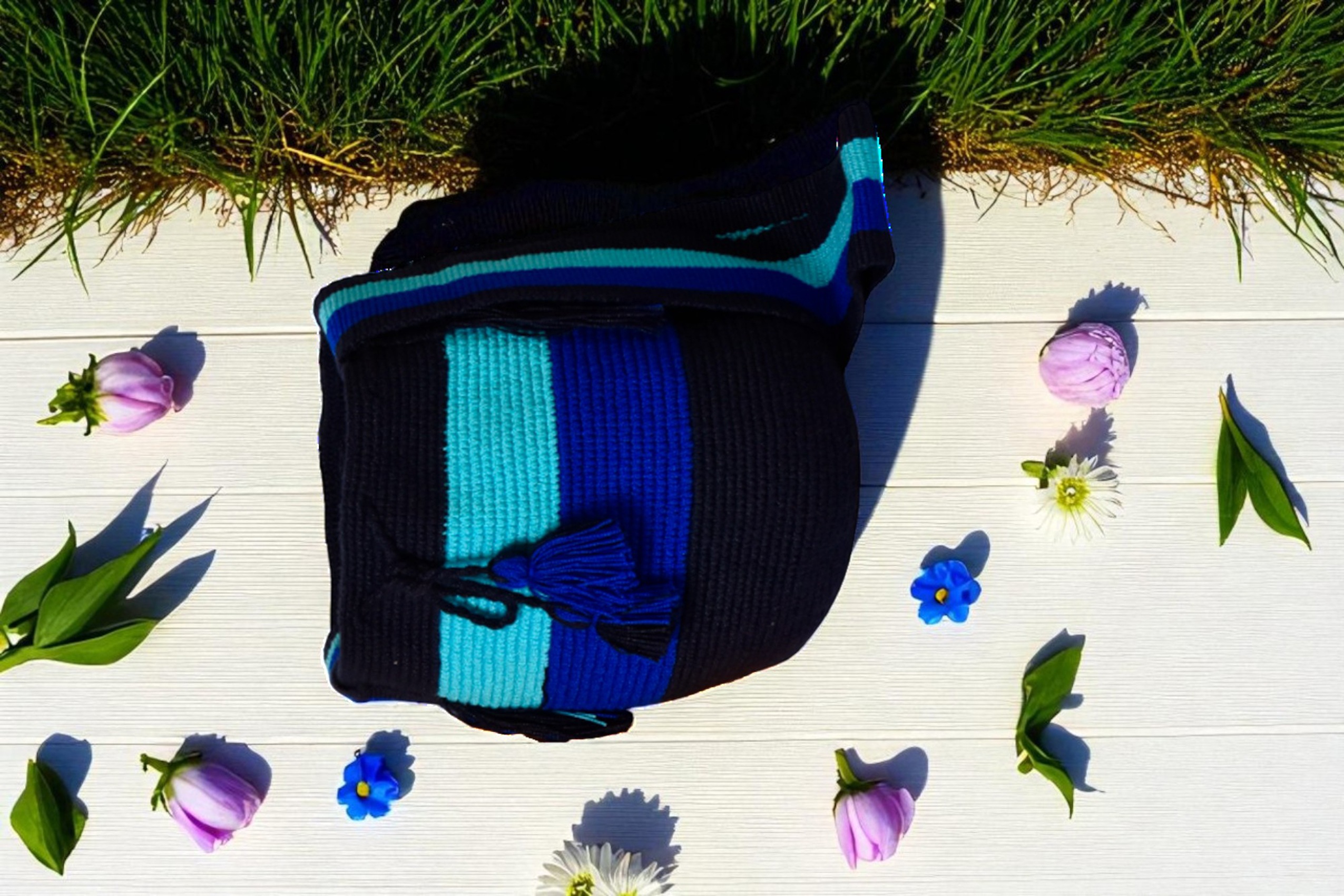 Descipcion: Hecho a mano en tejido a crochet, color azules diversos, decorada recamada con perla, envío incluido