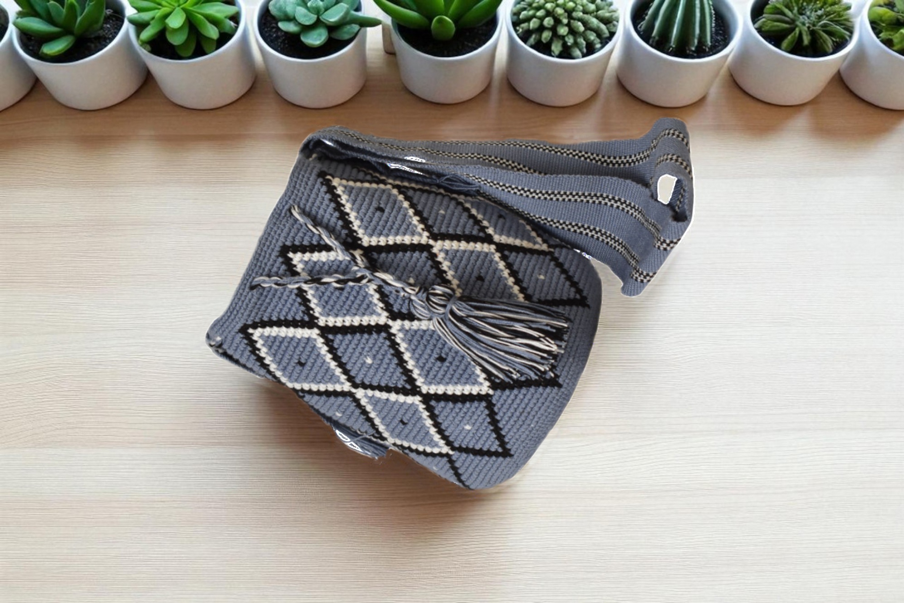 Descipcion: Mochila tejida en crochet con figuras en diamante con colgante es tejido fino