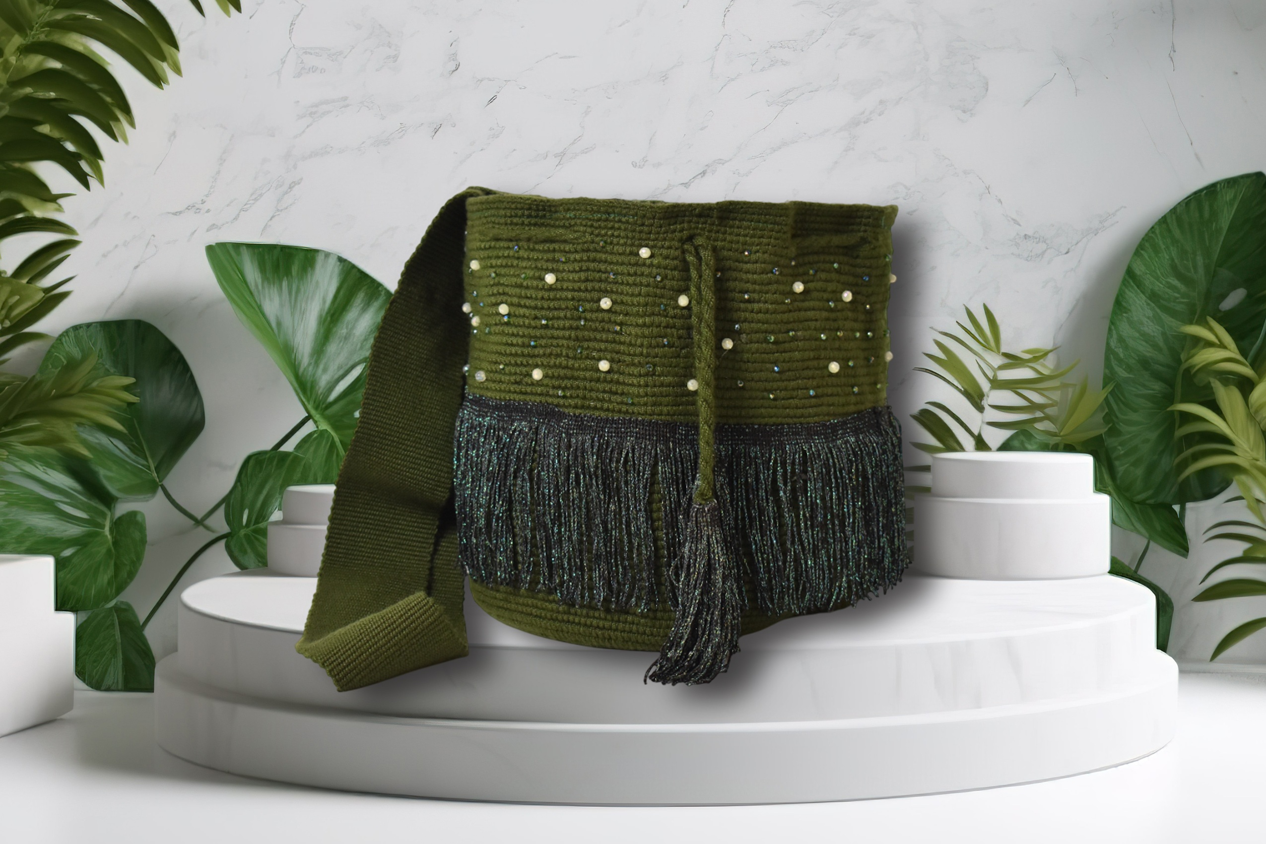 Descipcion: Hecho a mano, con flecos recamada y perla, color verde olivo, envío incluido.