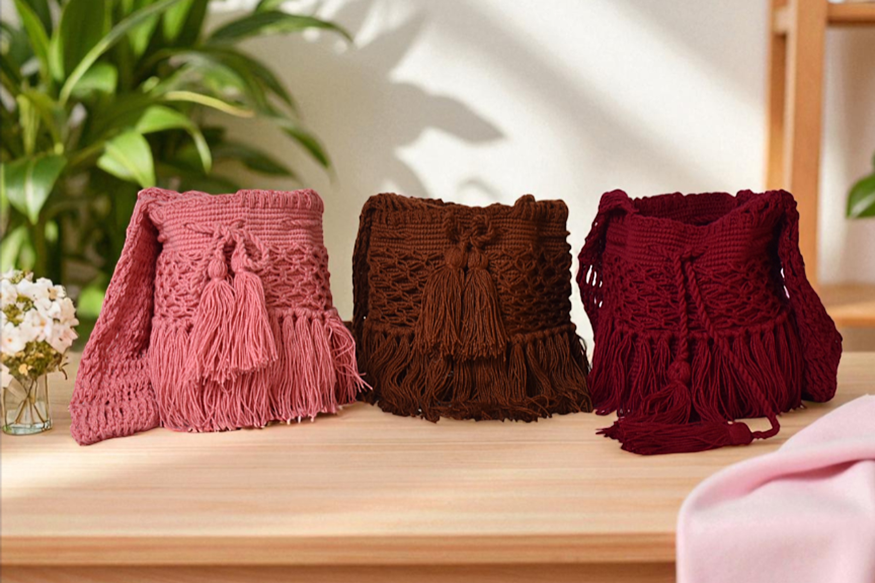 Descipcion: Hecho a mano en tejido a crochet macramé, en colores surtidos colores rosado bebe, vino tinto, tabaco, venta y precio por unidad y combo, envío incluido.
