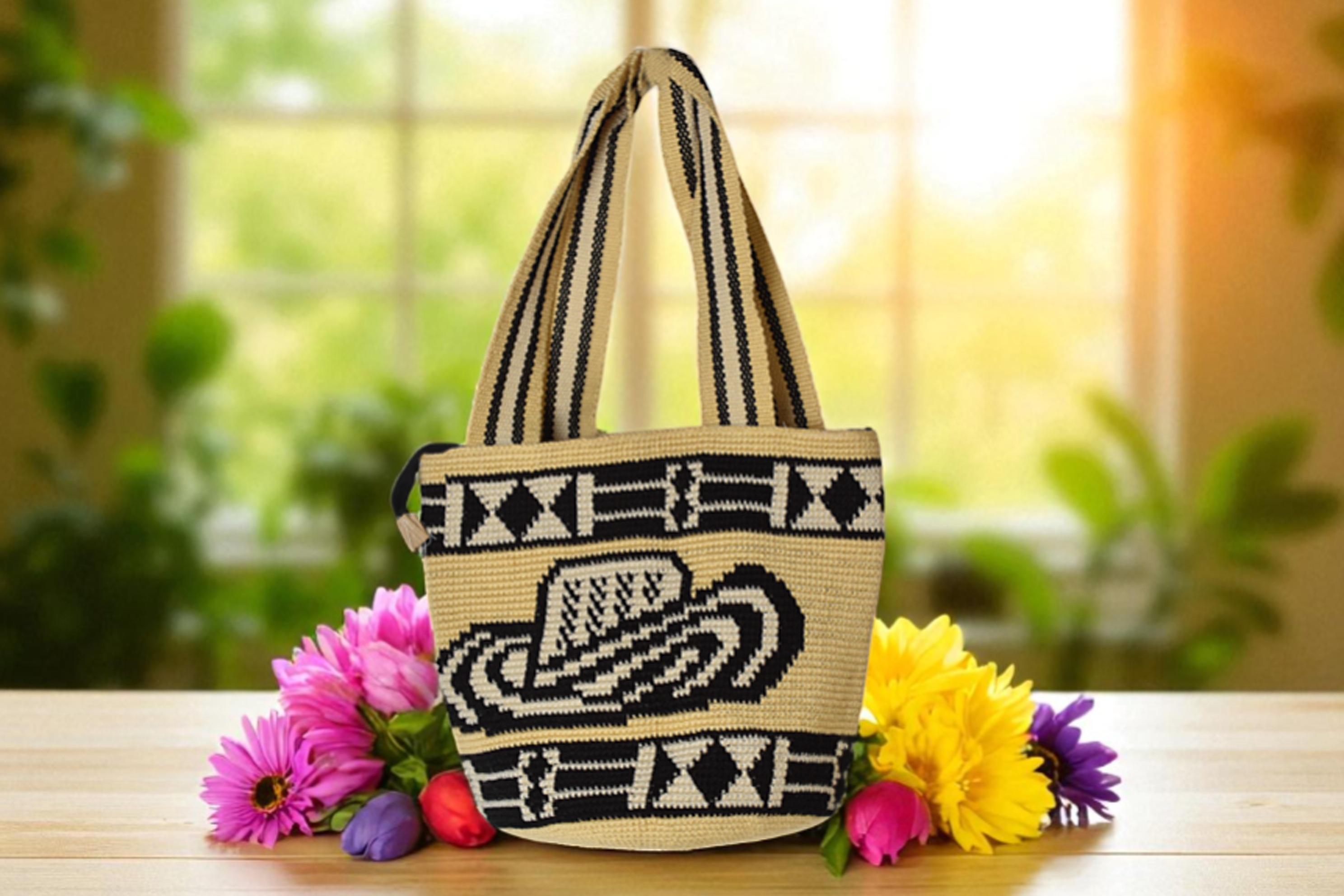 Descipcion: Hecho a mano en tejido a crochet, velar vertical. color fondo beige con negro, dibujo de sombrero sabanero y cinta grafica cultura Zenú, envío incluido.